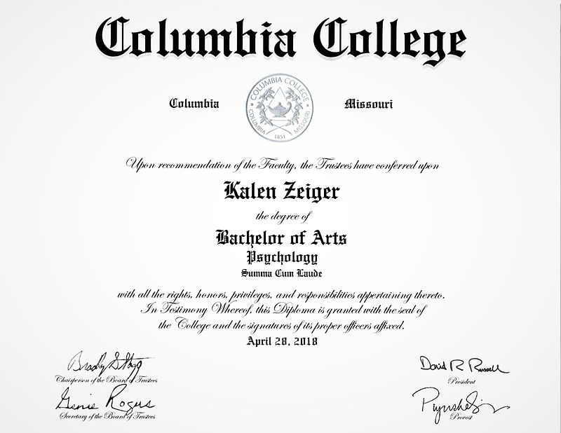 I started college for the first time in the Spring of 2016 and graduated, Summa Cum Laude, in the Spring of 2018 with a Bachelor of Arts majoring in Psychology and three minors in Anthropology, Sociology, and Women's Studies.