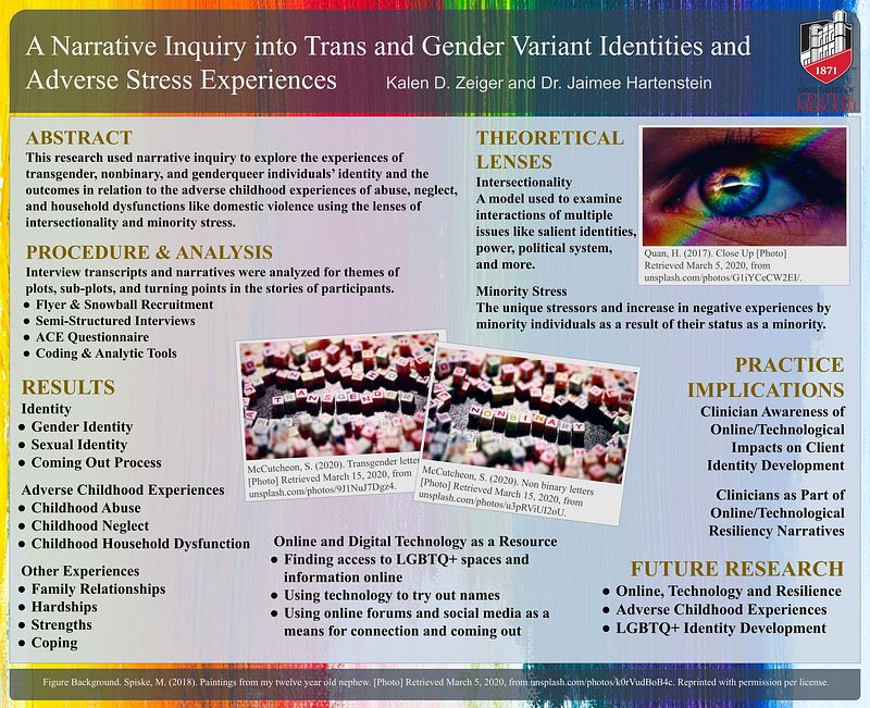 Level I Award for Research Poster and Presentation: A Narrative Inquiry into Trans and Gender Variant Identities and Adverse Stress Experiences, Graduate Scholars Symposium - University of Central Missouri, Warrensburg, MO